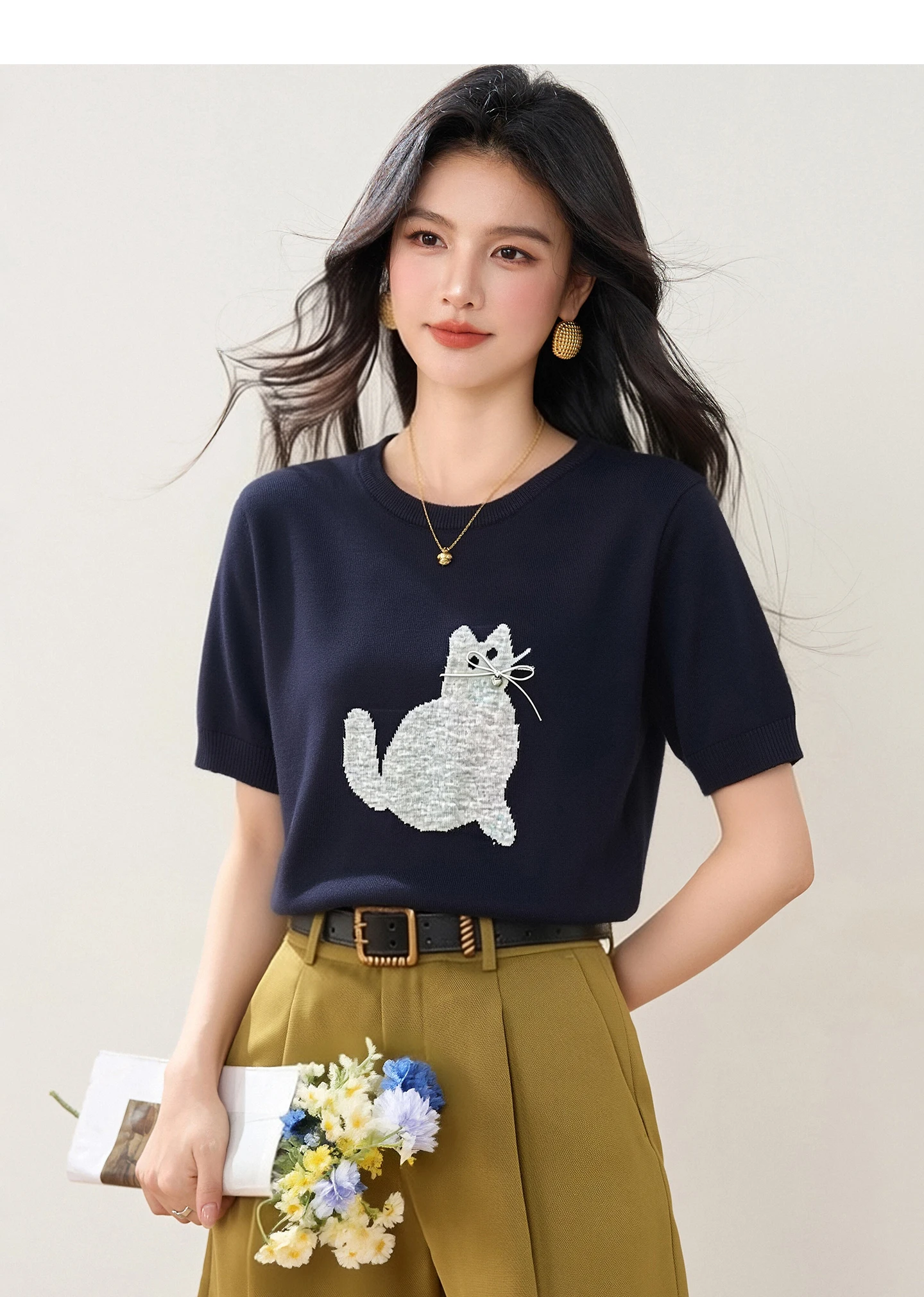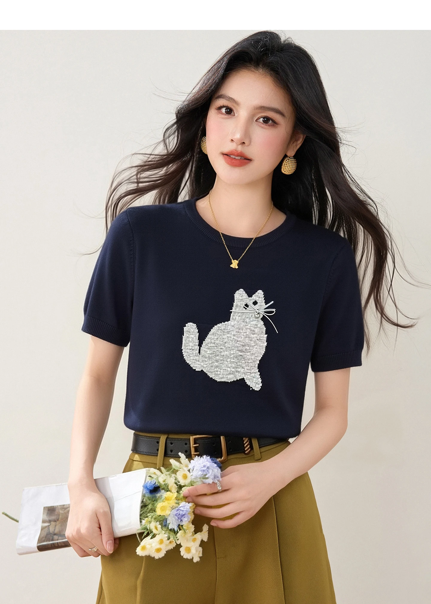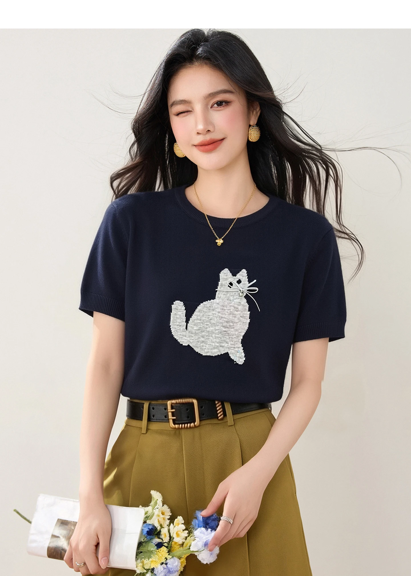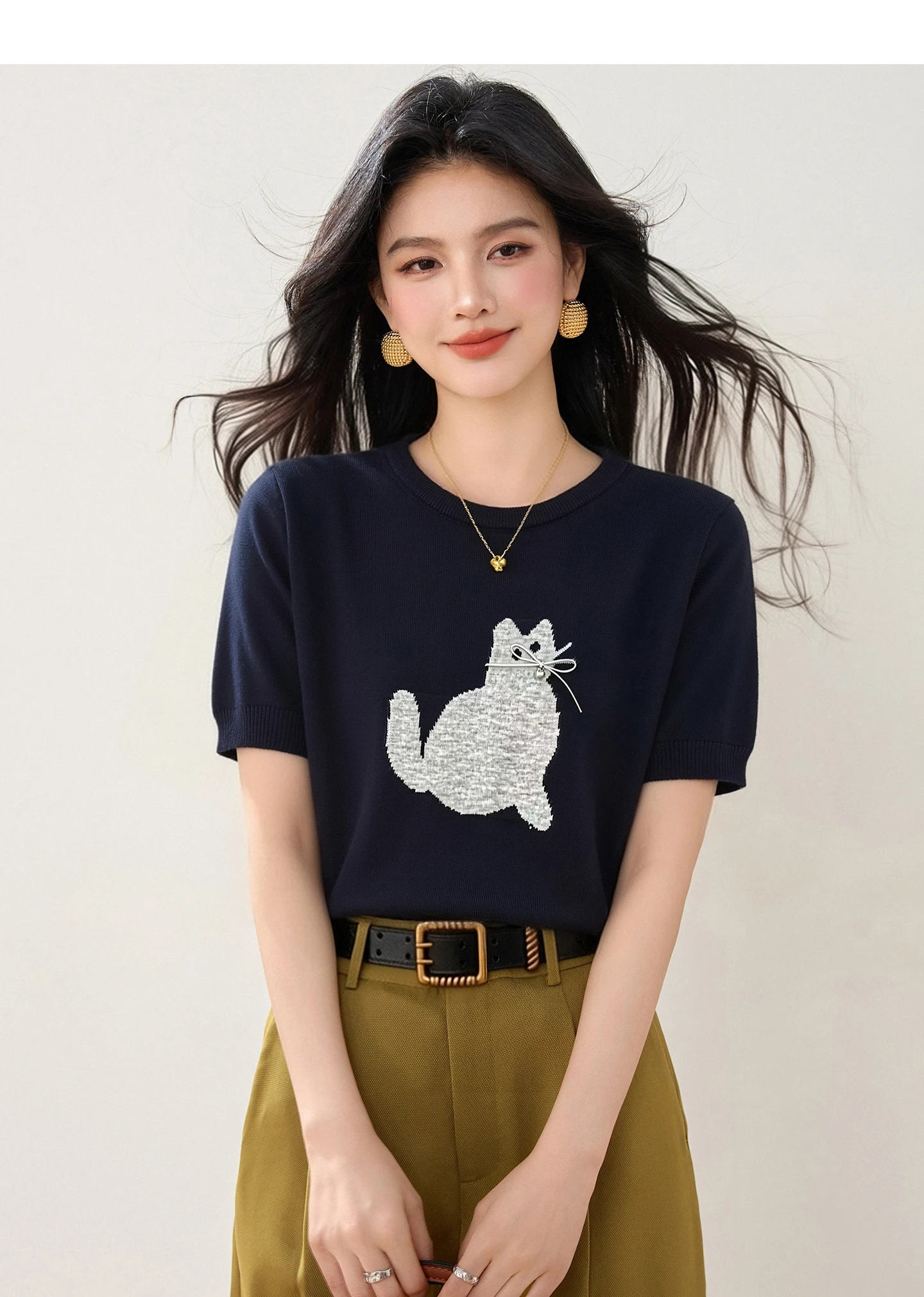 New Summer Cute Cartoon Cat Crew Neck Short Sleeve Printed T-Shirt Versatile Pullover Korean Style Fashion Casual Women's Top